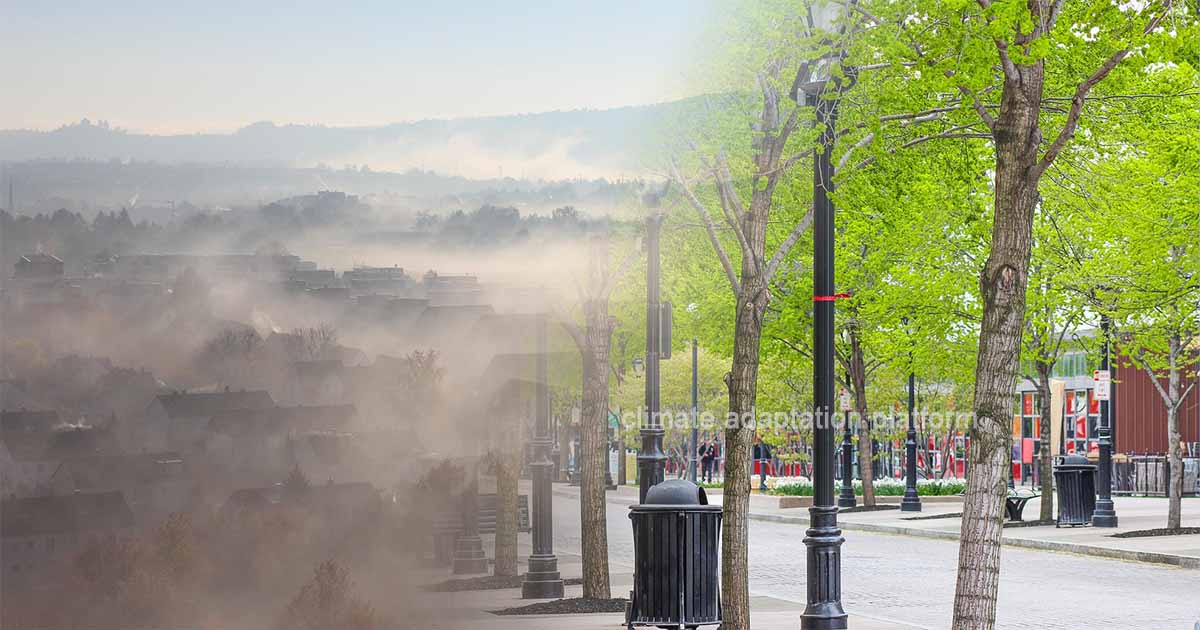 Green spaces such as urban parks and forests are cooler than paved areas due to evapotranspiration—the process by which plants release water vapour, cooling the air.